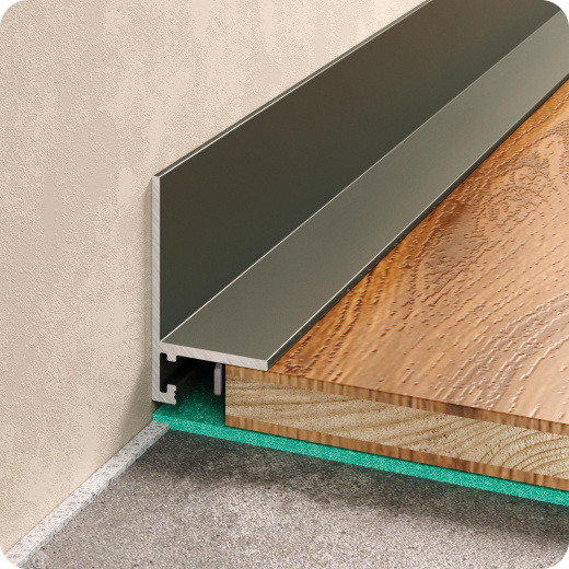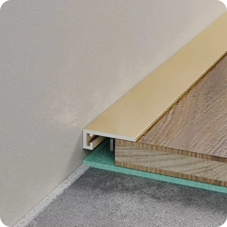 Профиль перекрывает технологический зазор, позволяя напольному покрытию «дышать»: расширяться и сужаться при перепадах температуры и влажности без деформации. -