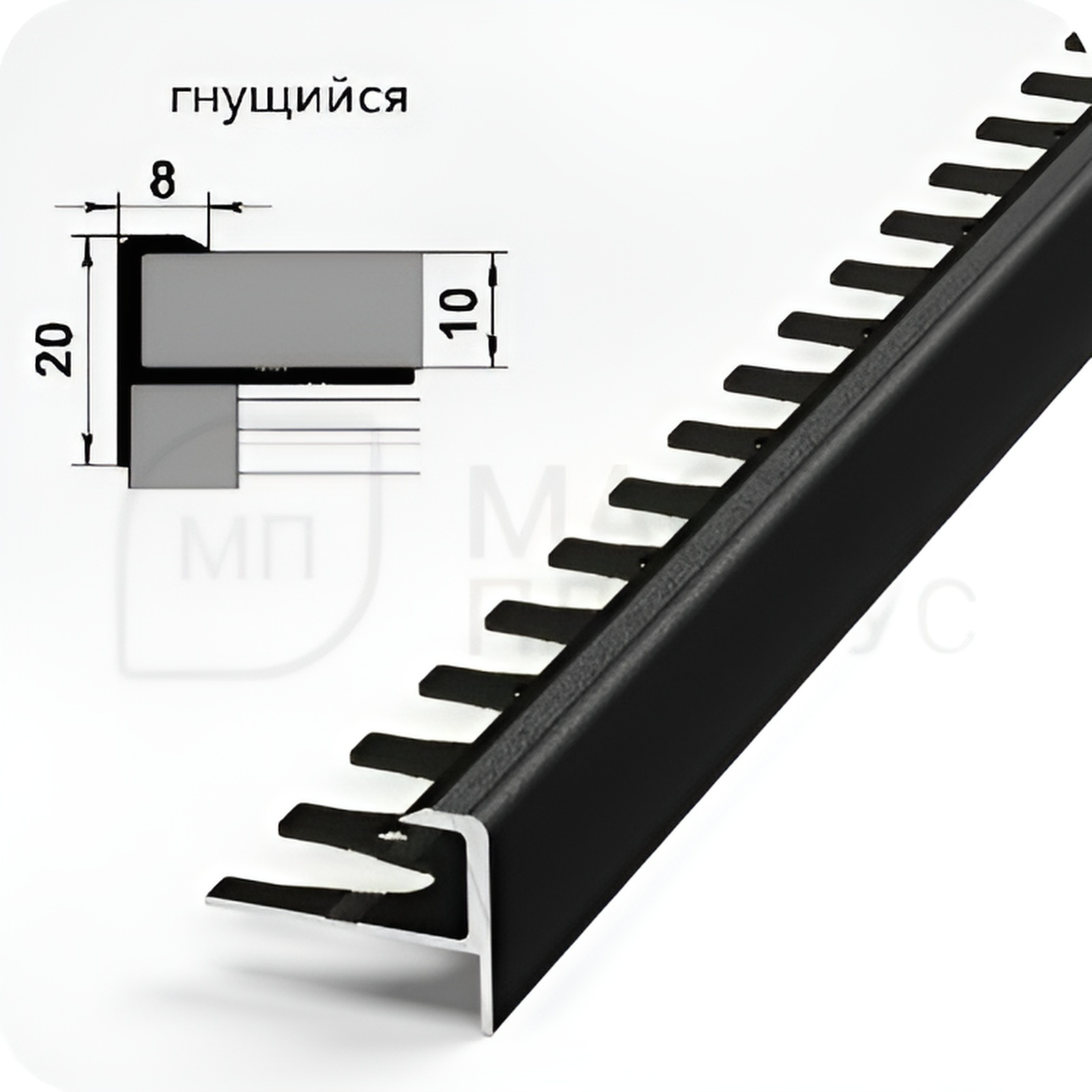 - Профиль обладает F-образной формой, что позволяет ему удобно и надежно фиксироваться на краю ступени. Благодаря своей геометрии, он также предотвращает откалывание плитки и защищает кромку от повреждений.