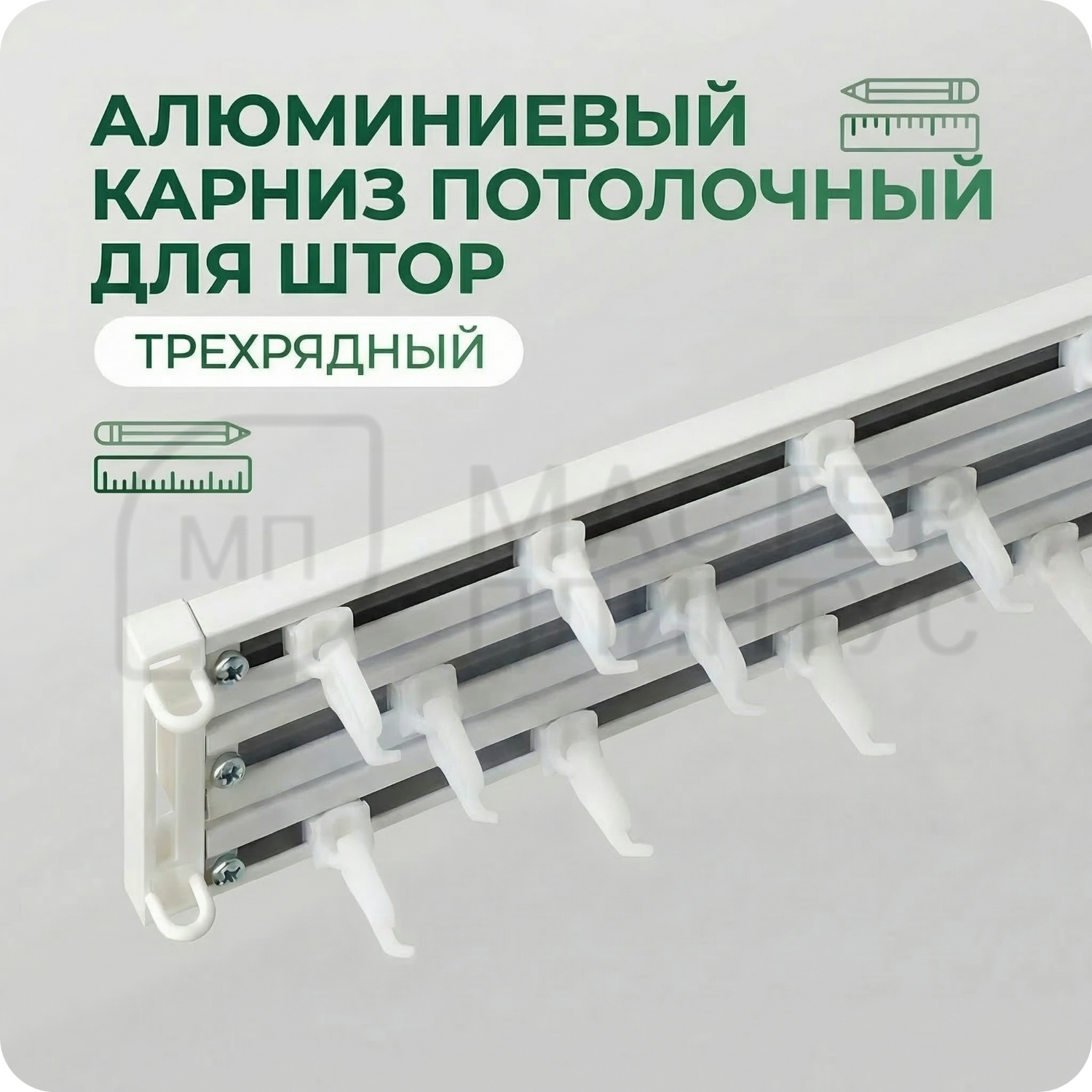 Трехрядный алюминиевый карниз «Трэк Уют» длиной 2,6 м — это потолочный карниз из алюминия, который подходит для установки штор и гардин.