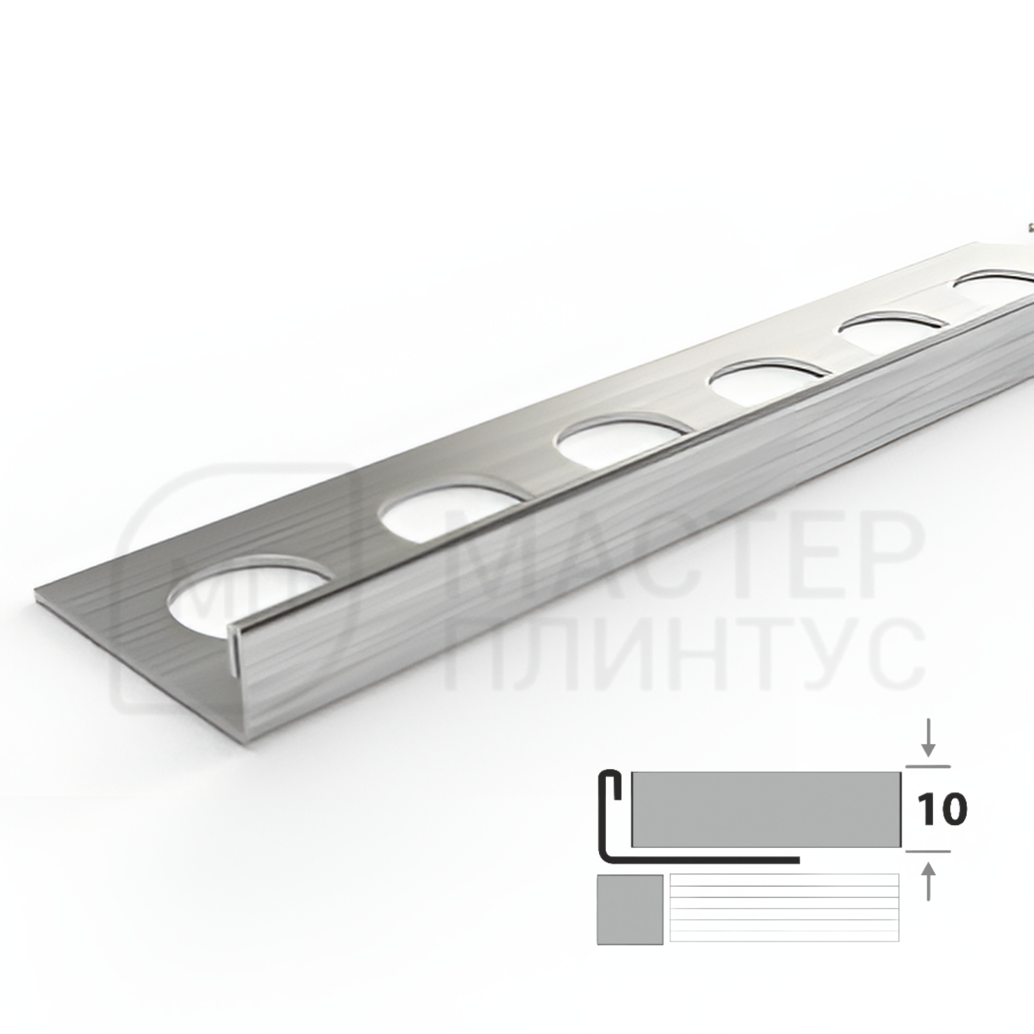 Профиль из нержавеющей стали Лука ПК 01 сатинированный 10 мм., предназначенный для декоративной отделки и защиты краев керамической плитки. Изделие сочетает в себе функциональность и современный дизайн.