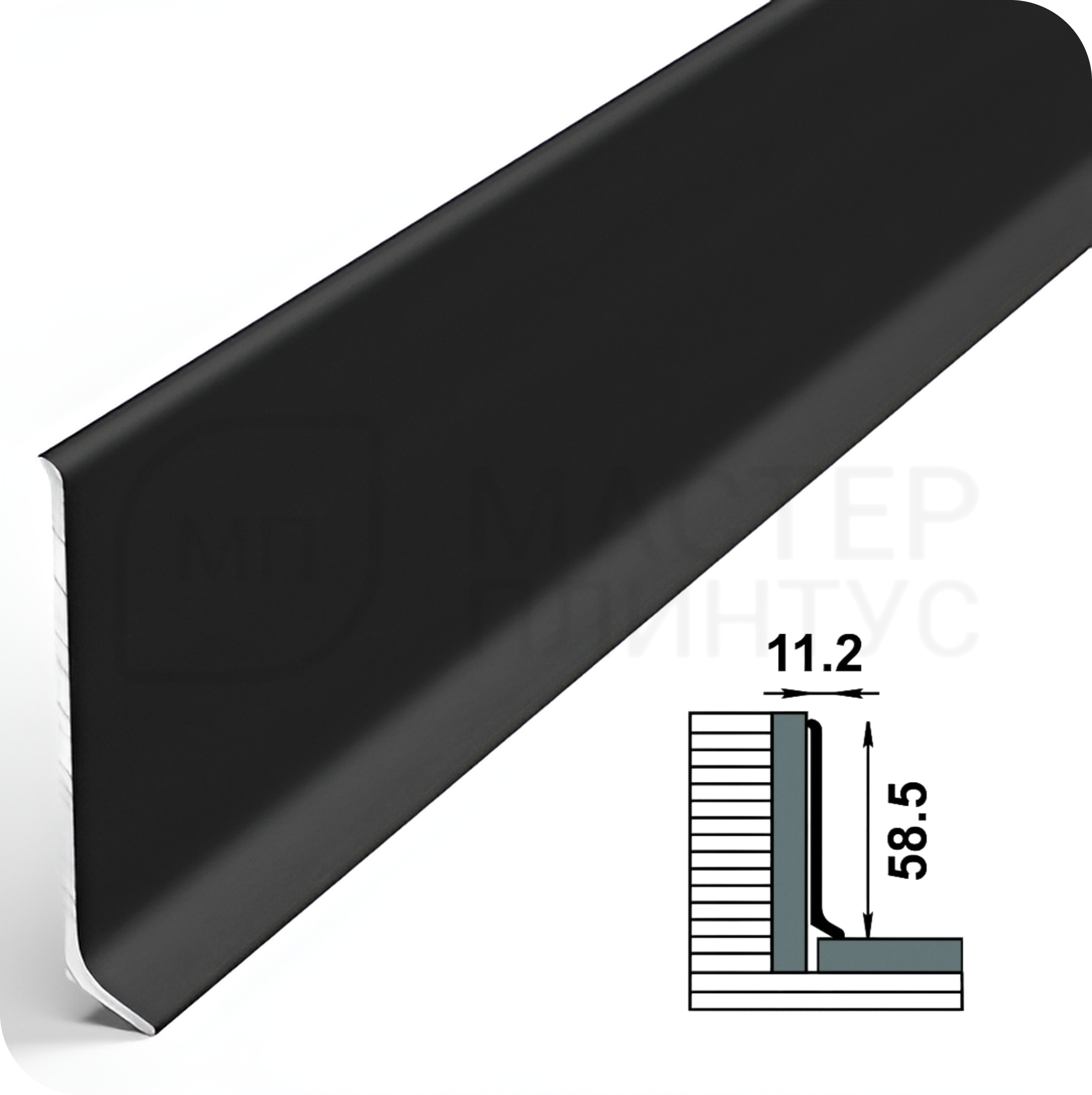 Высота плинтуса составляет 58,5 мм, а длина - 2500 мм. Он эффективно перекрывает зазор между стеной и напольным покрытием до 11,2 мм.