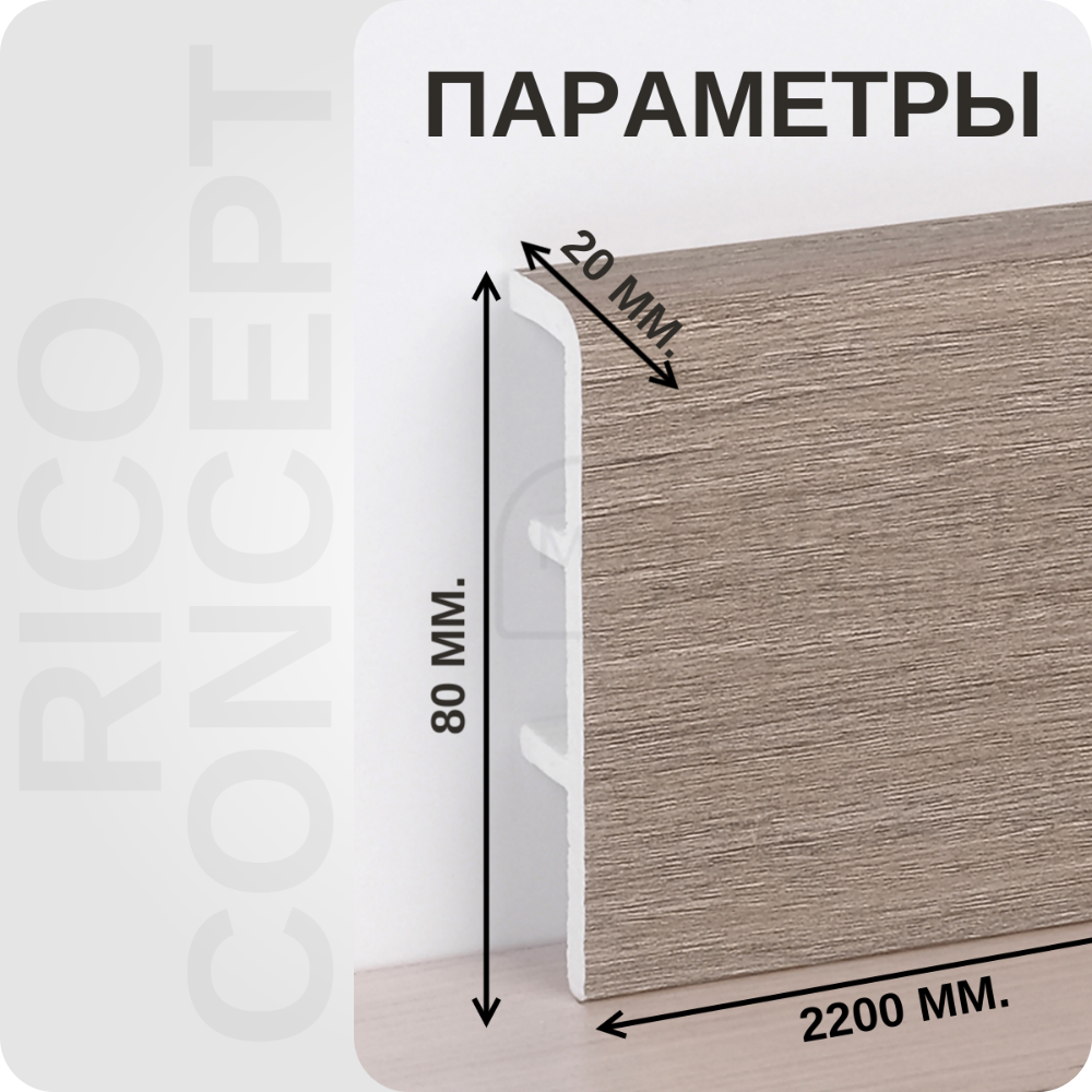 Rico Concept - это уникальный плинтус из ПВХ премиум-класса. В своем исполнении он повторяет самые популярные декоры напольных покрытий, а рельеф поверхности в точности отражает структуру натурального дерева. Геометрия профиля отвечает современным тенденциям в отделке жилых и коммерческих помещений. Плинтус выполнен из ударопрочного вспененного ПВХ, что делает его износостойким и позволяет устанавливать в проходных местах помещений. Скрытый крепеж на клипсу дает возможность многократно снимать и устанавливать плинтус для прокладки коммуникаций, оклейки обоев или окрашивания стен.