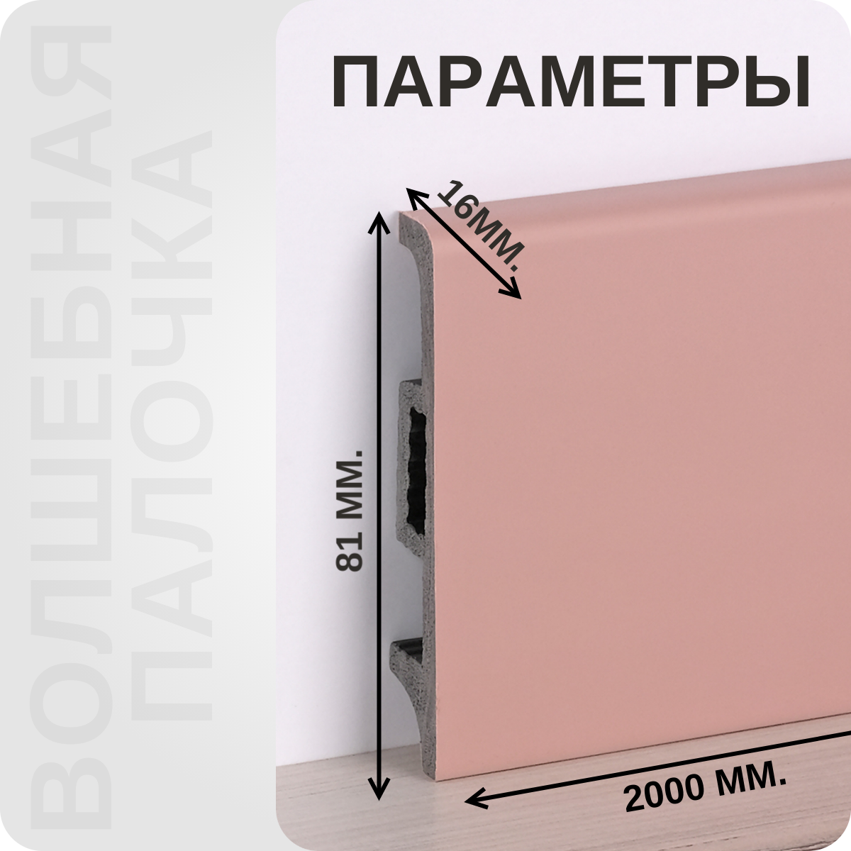 БрендВолшебная палочкаСтрана производительРоссияМатериалВспененный ПВХЦветРозовыйВысота81 мм.Длина2000 мм.Толщина16 мм.Способ монтажаМонтажная клипса/КлейОсобенностиС кабель каналомЕдиница измеренияшт