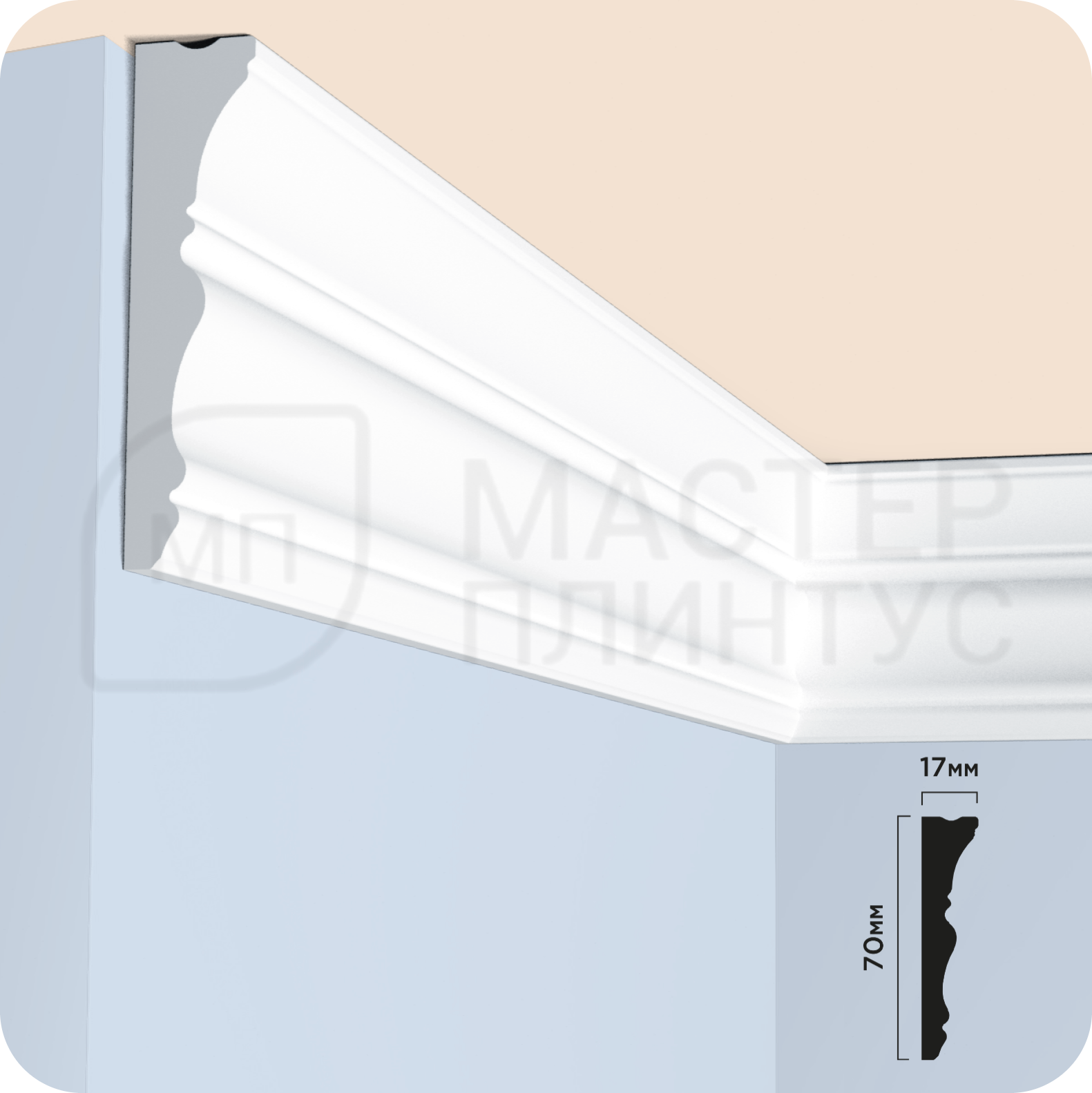 Потолочный плинтус из дюрополимера HIWOOD М1707 под покраску — легкий и прочный элемент декора, который легко монтируется и позволяет создать аккуратный переход между потолком и стенами.