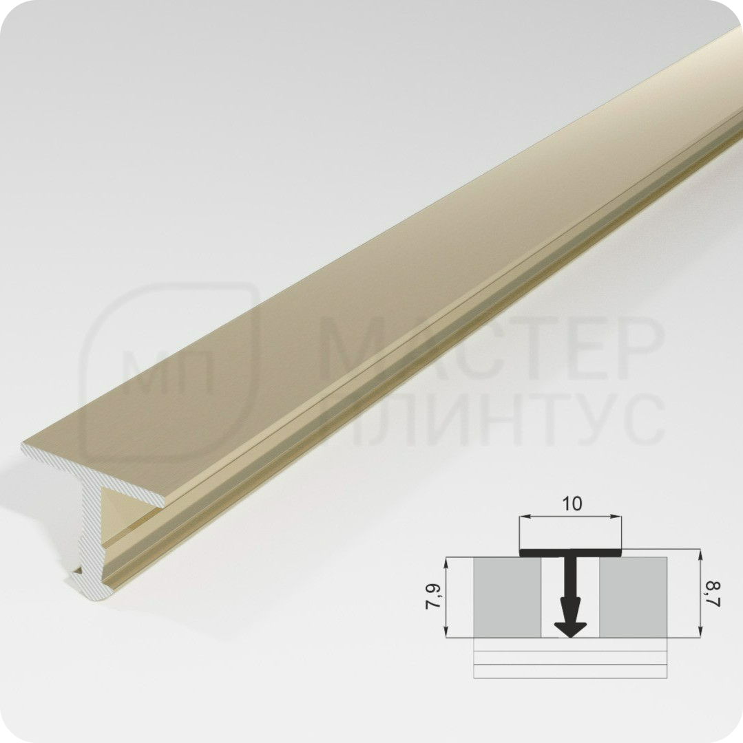 - Алюминиевый Т образный порог — это прочный и легкий элемент, предназначенный для плавного перехода между различными напольными покрытиями. Он выполнен из алюминия, что обеспечивает отличную устойчивость к коррозии и механическим повреждениям.