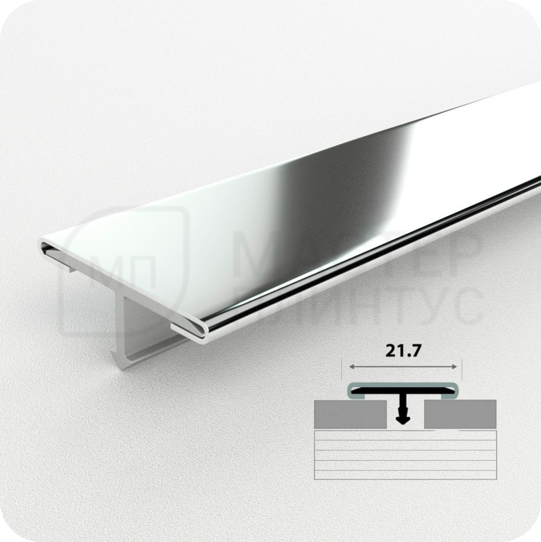 Т-образный стыкоперекрывающий профиль ЛС 10 Зеркало серебро — это порожек из нержавеющей стали марки AISI 304, который используется для соединения разных типов напольных покрытий, находящихся на одном уровне.