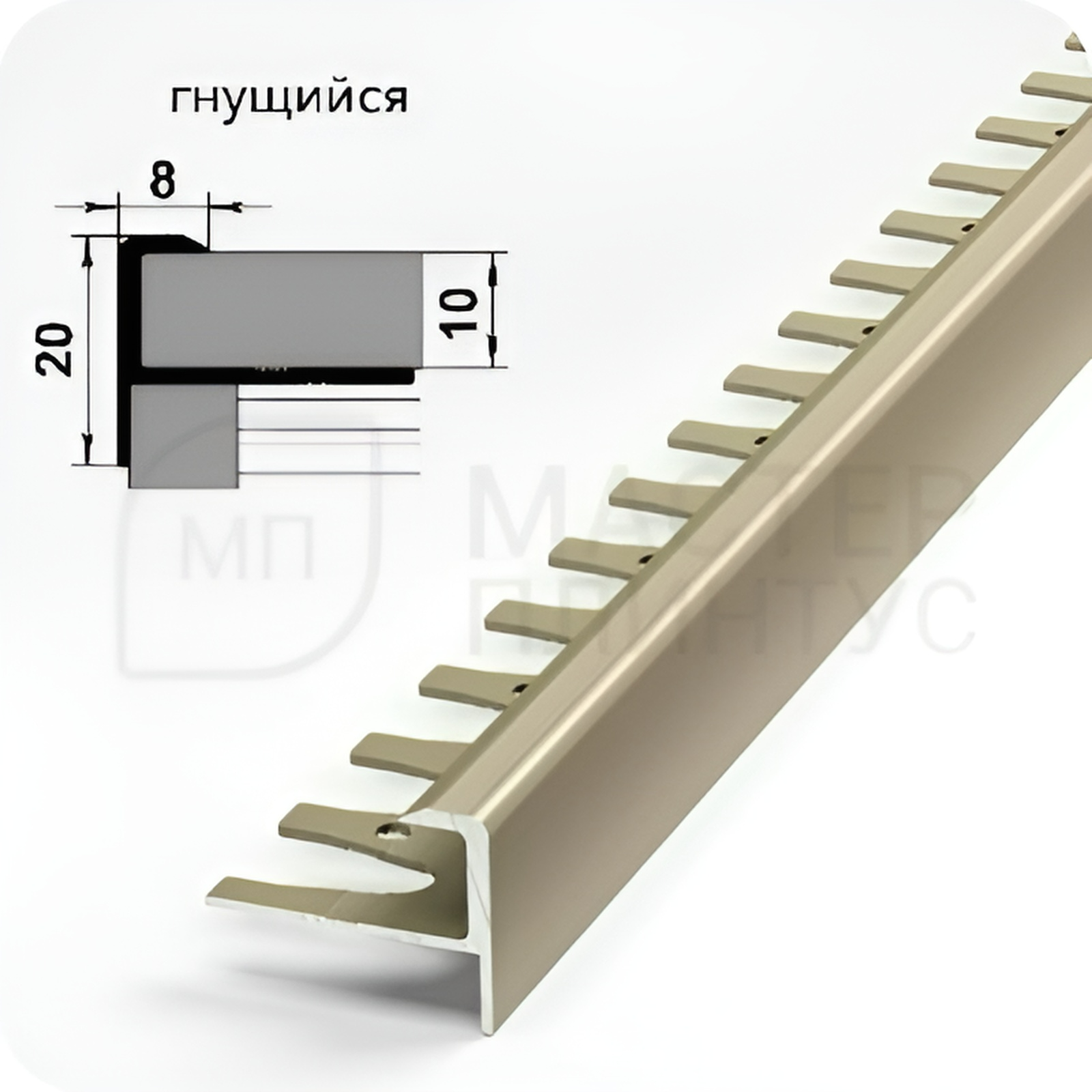 - Профиль обладает F-образной формой, что позволяет ему удобно и надежно фиксироваться на краю ступени. Благодаря своей геометрии, он также предотвращает откалывание плитки и защищает кромку от повреждений.