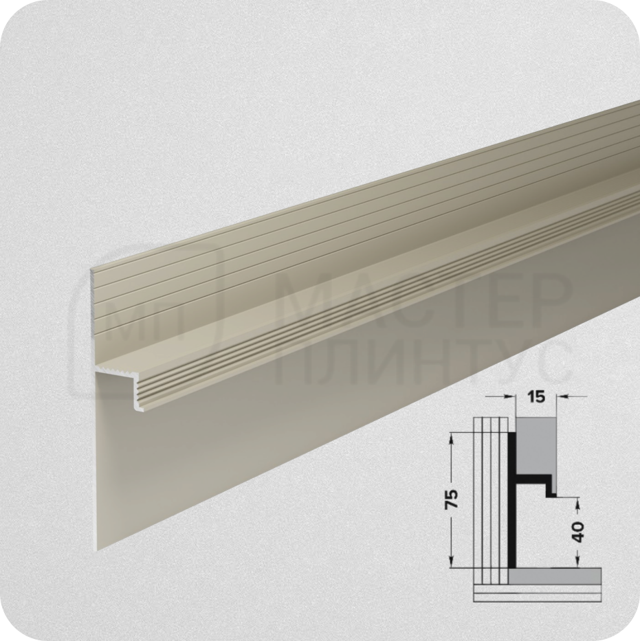 Скрытый плинтус Плт 75 шампань от бренда «Лука» — это элегантное и практичное решение для современных интерьеров. Этот плинтус создаёт зазор между полом и стеной, что визуально придаёт помещению объем и эффект парящей стены.