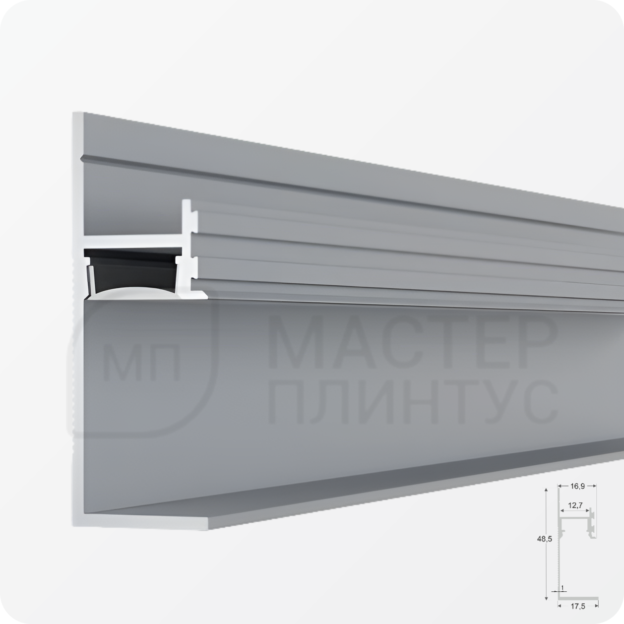 Скрытый плинтус ПО 196 серебро матовое — это элегантное и практичное решение для современных интерьеров. Этот плинтус создаёт зазор между полом и стеной, что визуально придаёт помещению объем и эффект парящей стены.