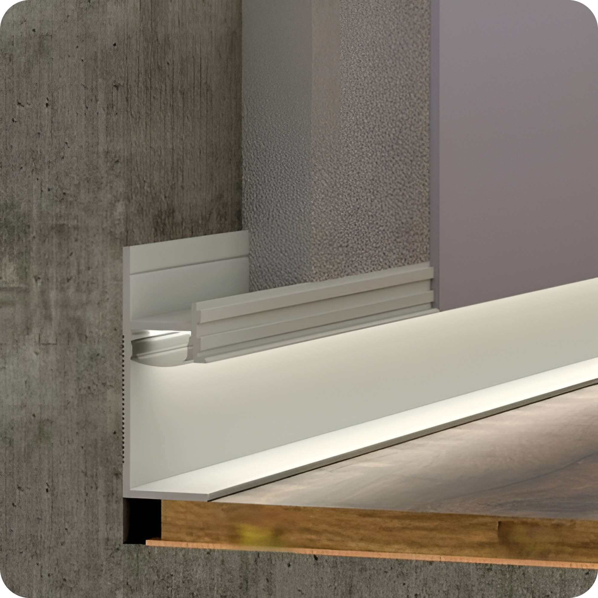Встроенная подсветка: плинтус спроектирован для интеграции светодиодной ленты: мягкий рассеянный свет подчёркивает линии интерьера и создаёт уютную атмосферу.